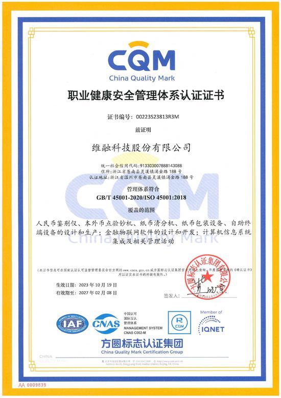 職業健康安全管理體系CQM認證證書