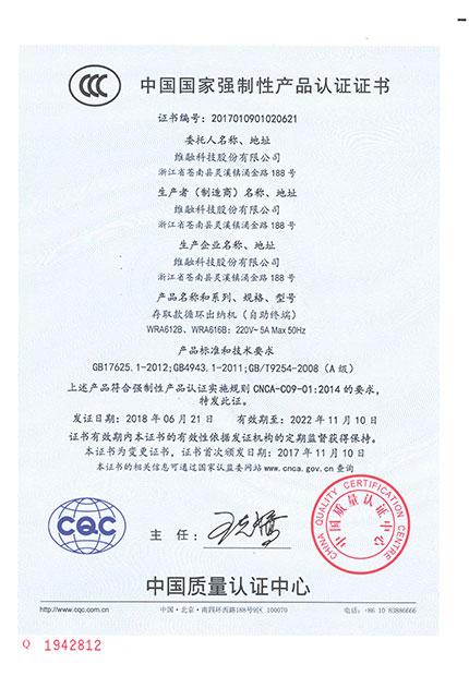 存取款循環出納機(WRA612)CCC證書