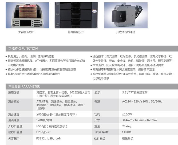 支持多國貨幣點驗功能,支持多語言菜單界面功能,多光譜反射圖像+透射圖像鑒別系統(tǒng)。<br>類型: 插電式<br>顏色: 亞光黑 灰黑色<br>品牌: 維融<br>型號: WR6201 2+1紙幣清分機