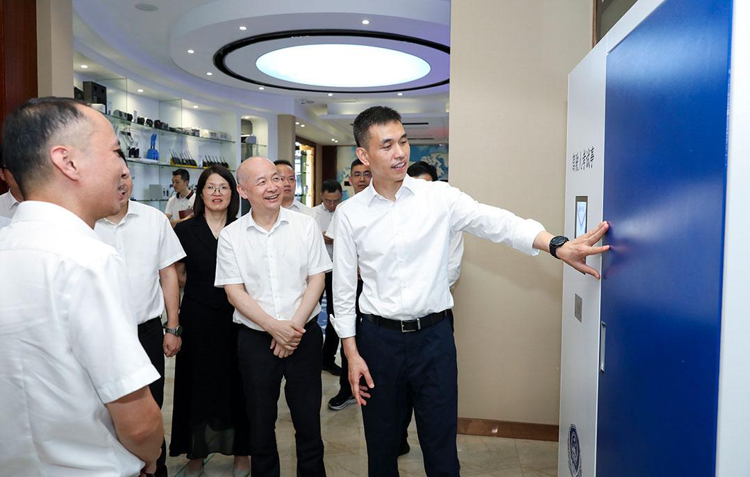 視察中,張書記一行參觀了維融產品展示體驗館,對不動產產權制證機、警務通綜合業務機、駕駛員體檢機、駕駛員考試機、駕駛證制證機、智慧貴金屬庫等幾款產品表示十分感興趣。張書記對維融這幾年的科研成果予以肯定,并向企業發展提出了寶貴的建議,鼓勵維融能擴大市場份額,有效提升產品銷售業績,積極提升企業整體競爭力并往資本市場發展。