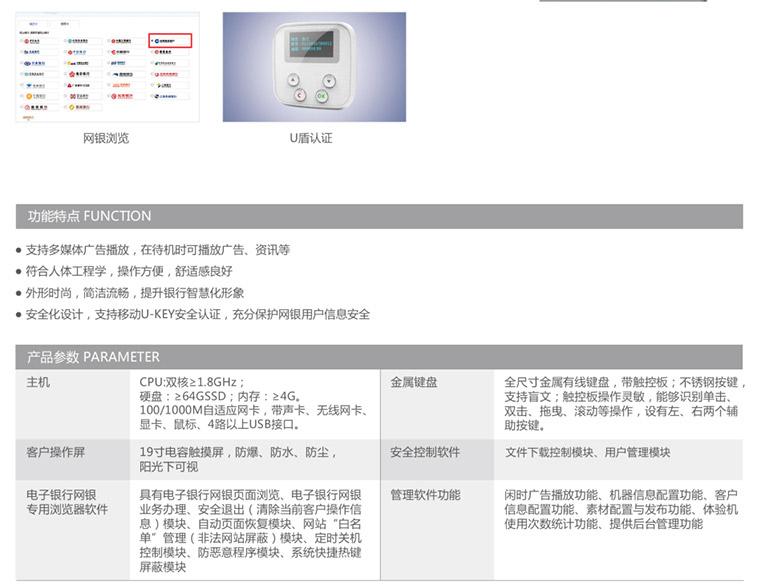 自助網銀終端具有查詢、瀏覽、進行網上銀行自助服務功能的智能 設備。<br>類型: 插電式<br>顏色: <br>品牌: 維融<br>型號: WRZ550